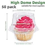 Packaging includes 50 clear plastic individual cupcake dome holders with repeatable hinged lids that lock securely into place to ensure freshness