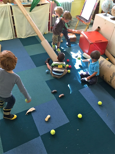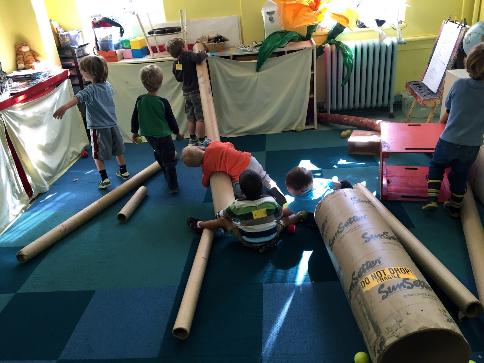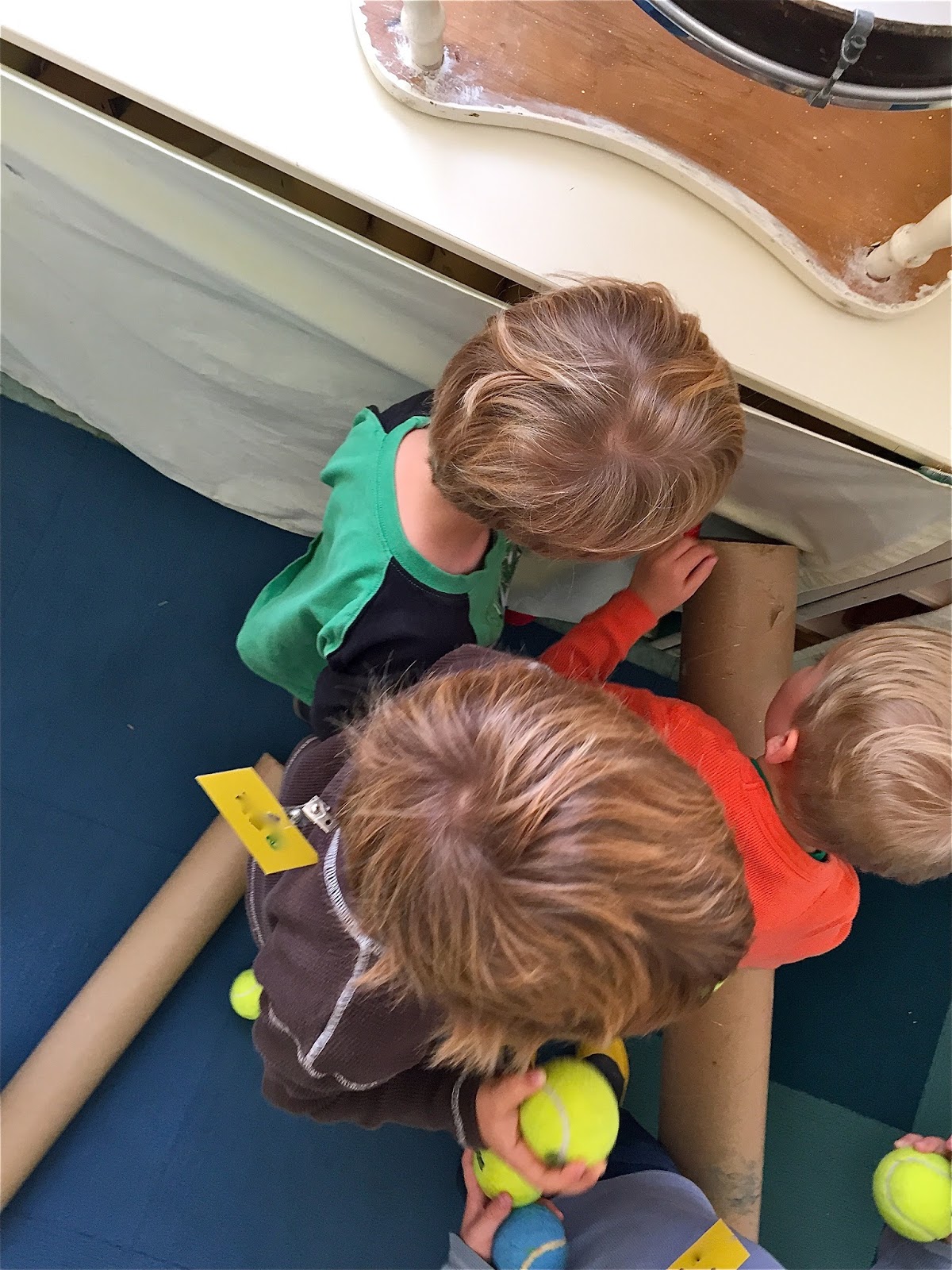 For instance, a group of four and five-year-olds, mostly boys, found themselves playing together with a collection of cardboard tubes and tennis balls. For the first 15 minutes or so, they engaged like independent agents, each arranging tubes, and collecting balls for their own personal use. That time passed relatively quietly, with each of them exploring and experimenting.