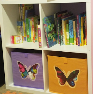 - Use butterfly themed storage cubes: These are very cute butterfly storage cubes and they come in a pack of four. Each one has a butterfly peephole at the front. They can fit perfectly into an IKEA Kallax bookshelf.