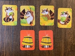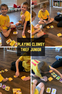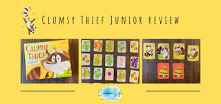 I love that young players use mental math in this game. Cards are constantly switching hands so you never know how things will end up and who will win 😉. I like that all players are playing at the same time so there is never a lull. This is a fairly fast paced game and it generally takes ~ 10 minutes for us to finish a complete game. Clumsy Thief Junior is currently included in Timberdoodle's Kindergarten Curriculum Kit and we definitely recommend it. Just watch out for that sneaky raccoon 🦝.