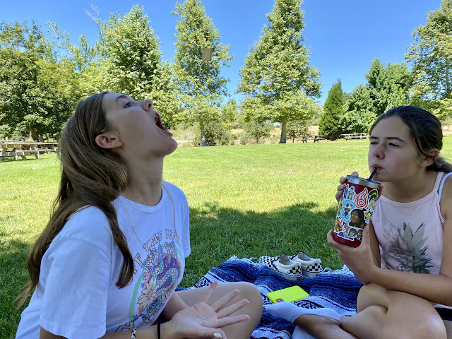 Both girls are back to school today! They were very excited to be going back to in person finally and I can't wait to hear all about it when I pick them up but before school began we had our annual End of Summer Picnic. This tradition started ten years ago right before Kayla began Kindergarten. I can't believe how long we've been enjoying this simple and fun tradition. The girls still enjoy it! This year we packed a little snack type lunch and hung out on the blanket, playing cards, reading some classic back to school kid books that we've had forever and we laughed, A LOT! These two crack themselves up and have so much fun together. We were all laughing at their silly antics of trying to catch alphabet cookies in their mouths. I love spending time with them and will miss them a lot this year. I've been so used to having them home with me all day, everyday it's going to feel a bit strange being apart but I'm so happy for them to back with their friends and in the classroom again!