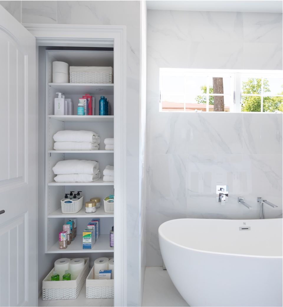 - Items like extra towels, shampoo, toilet paper and so on, are best stored on a shelf in a linen closet or other storage area outside of but near to the bathroom.