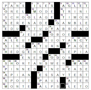 Theme: ESSAY TEST (55. Exam answered in a blue book ... and a phonetic hint to 17-, 23- and 44-Across) - Each theme entry is in the pattern of S* A* and they're all study-related: