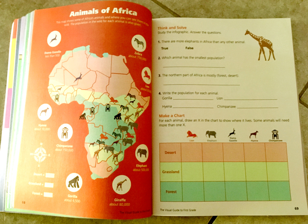 Look at that gorgeous page on space! Space is a major theme in several of the Visual Guide books (see the bottom of this page for links to all the books and a listing of their major themes). My child really responds well to colorful, quality graphics in workbooks and worksheets like these. But while you can find a loot of great free worksheets online, pages with colorful backgrounds like this are expensive to print, so if you want something like this, it's actually cheaper in the long run to buy workbooks like these.
