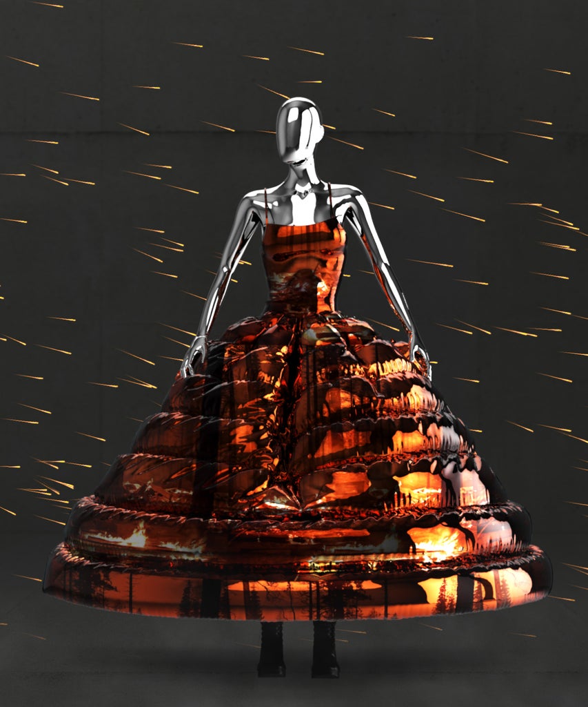 The collection reflected Subkoff’s dystopian mentality: Avatars walked through fire-lit forests wearing metallic hoodies, leggings, cut-out tops, and ballgowns that looked like they were made with the last remaining foil on Earth after the great collapse. The message is not a departure from the brand’s longstanding commentary on consumerism and climate change: Last September, Subkoff presented a collection that included scribbles that read “the more you consume, the less you live” over jackets, dresses, and pants.