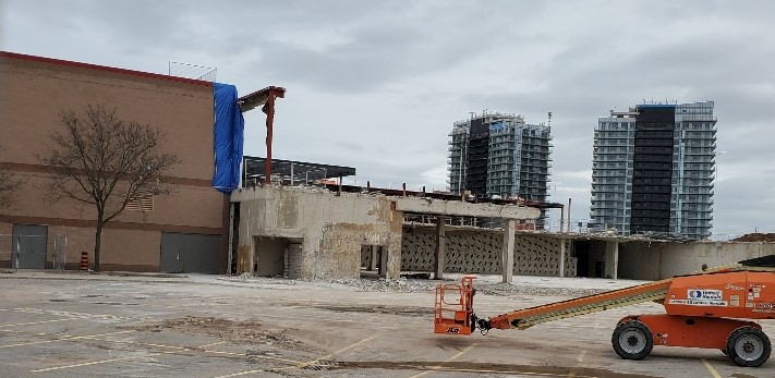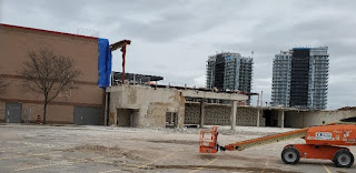The first is the mall. I think the deconstruction is pretty much complete. They did remove over half of the existing building. I saw them putting up some new steel beams the other day - those darker ones in the middle of the picture and the next day a couple of cement trucks were there. The rubble is mostly cleared up and well, we just have to wait and see what's going to happen next. It's great to walk around the mall as there are NO cars and no people.