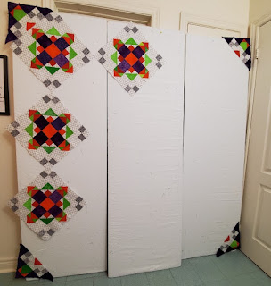 The blocks were together (it's sewn together in half blocks) and all the half blocks needed sashing which I had cut before I left for the retreat. Let's just say that it took forever to get the sashing on all those blocks. I laid it out on the design wall as I got the sashing on.