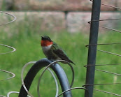 A different Hummingbird came to the feeder this morning.  At first it had its back to me so all I saw was the darker green of its body, then it sat on the crook of the feeder and I could see its throat.  It was a male!  Usually all my visitors are females but this one was a male.  I was so excited and thrilled that he posed for me showing off his ruby throat.