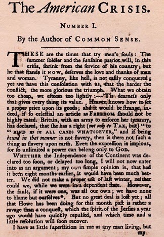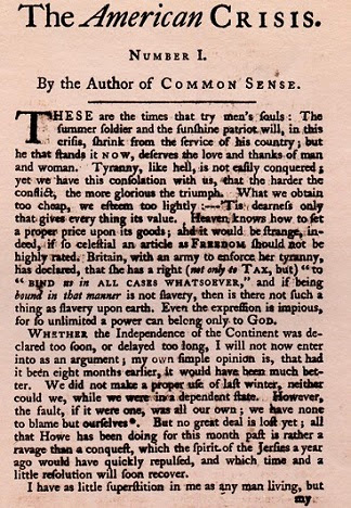 “These are the times that try men's souls. The summer soldier and the sunshine patriot will, in this crisis, shrink from the service of their country; but he that stands it now, deserves the love and thanks of man and woman. Tyranny, like hell, is not easily conquered; yet... it would be strange indeed if so celestial an article as freedom should not be highly rated. Britain, with an army to enforce her tyranny, has declared that she has a right...”to bind us in all cases whatsoever,”....Even the expression is impious; for so unlimited a power can belong only to God...There is a natural firmness in some minds which cannot be unlocked by trifles, but which, when unlocked, discovers a cabinet of fortitude; and I reckon it among those kind of public blessings...that God hath blessed (General Washington) with...a mind that can even flourish upon care....”
