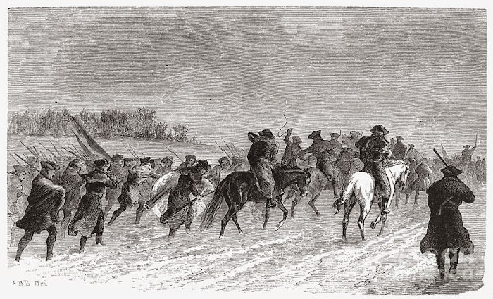 After noon, as the thermometer struggled to climb under lowering clouds, the men were were told to leave their personal effects in their huts and tent dugouts, and form into companies. The roll was called, and then the companies formed into battalions. The men were now each issued 60 musket balls and powder, and about three in the afternoon, with the winter solstice sun fading, 2,400 marched eight abreast in tight formations, three miles south to the ferry operated by Samuel McConkey. Major John Wilkinson, following on horseback, tracked his unit's progress through the hard packed week old snow “tinged here and there with blood from the feet of the men who wore broken shoes.” Near the ferry the troops formed up again, hidden from the river by high ground, to wait for darkness in a spitting rain. And to pass the time, the officers read to them a new pamphlet from the quill pen of Thomas Paine.
