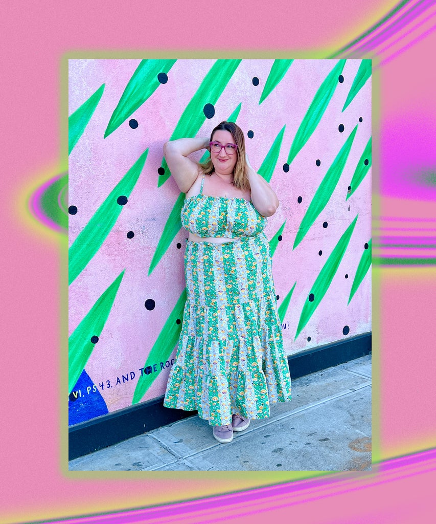 Designers Purna Khatau and Phoebe Vickers are known for great matching sets, so this striped floral co-ord was at the top of my try-on list. As soon as I put it on, I knew it was a winner. It is somehow absolutely precious without being saccharine. The crop top–maxi skirt combo feels very of the moment, and the lightweight cotton makes it breezy enough for the hottest of summer days. It layers well with the scallop bikini for a beachwear ensemble, but also would look right at home at a downtown brunch or on a picnic in the park. Unless you are blessed with extra curvy hips, I’d say size down if you are between sizes. I typically size up with non-stretch cotton, but, after experiencing how roomy this style runs, I’d get a 1x if ordering again.