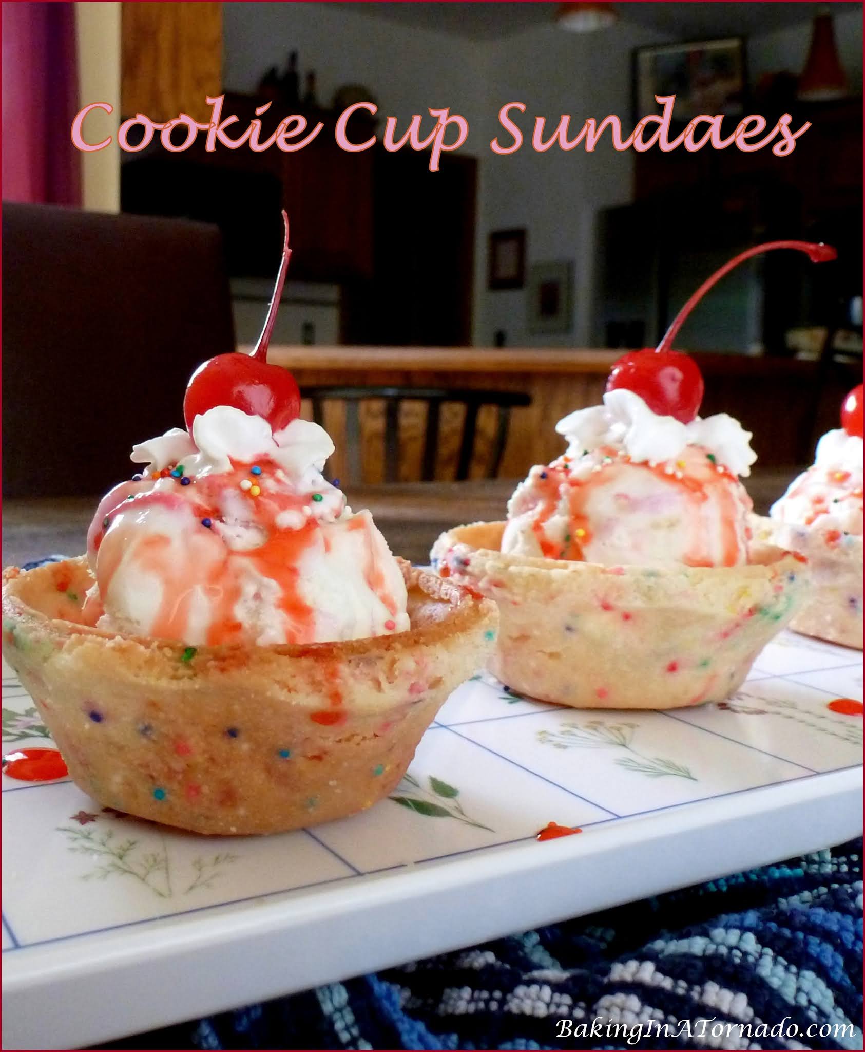 *To serve, fill each cookie cup with a large scoop of ice cream, drizzle with strawberry syrup, dollop with whipped cream, sprinkle with multicolored sprinkles or nonpareils, and top with a maraschino cherry.