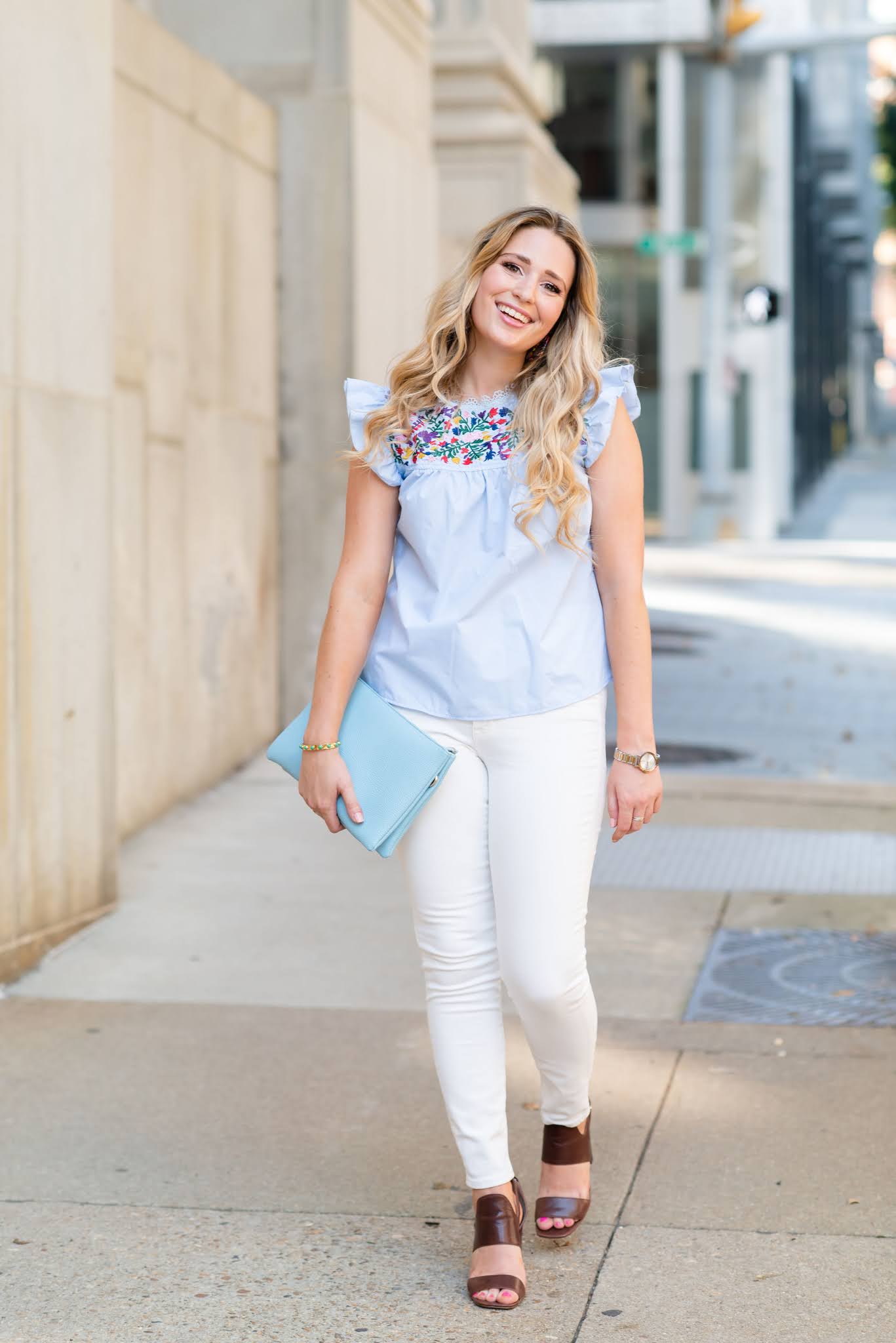 So what do my work outfits actually end up looking like? Well- a lot of them this summer look like the outfit pictured here in this post! I've been wearing white jeans a lot to work this summer, and I love how this outfit came together with chunky heels and this embroidered top. (I'd just switch the blue clutch for my trusty Tory Burch work bag on a M-F!) You can also see many more of my work outfits each month here on the blog- I do a monthly round-up every month! Here's the one for July.